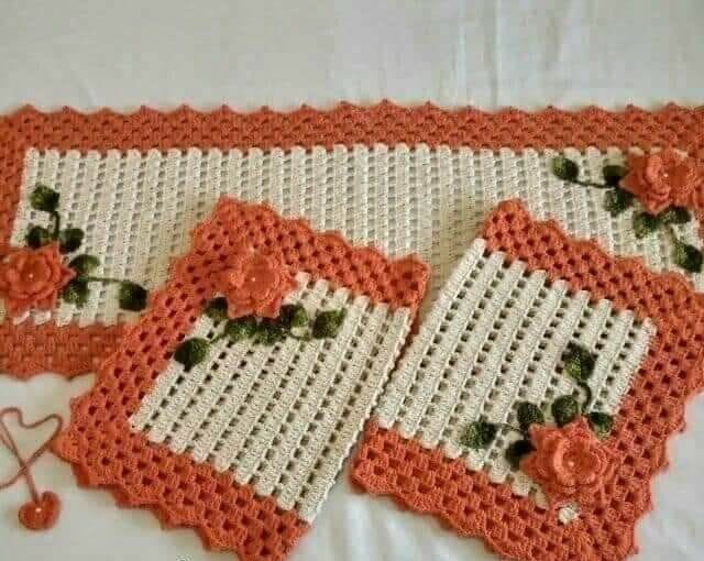 Jogo de tapete cozinha com flores em crochê 3 peças JC007
